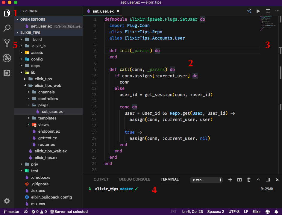 - The file explorer in the top left shows both the currently open files (open editors) and the project directory (elixir_tips)