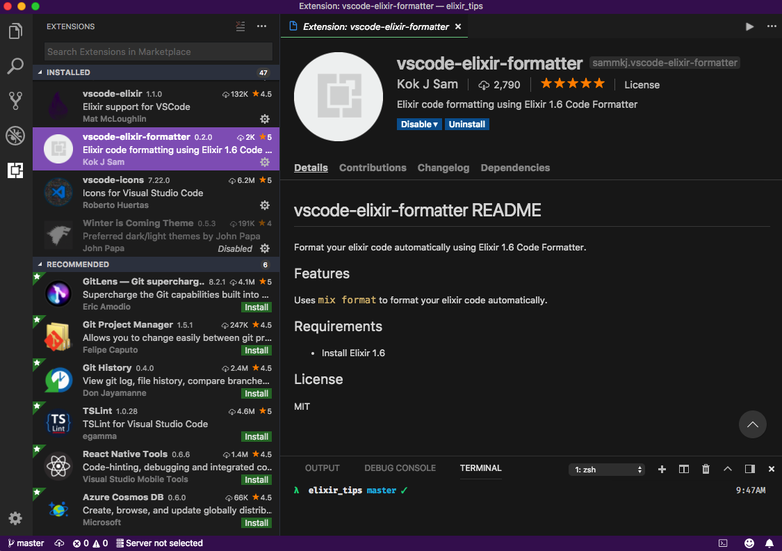 Here I have two Elixir-specific extensions shown, "vscode-elixir" and "vs-code-elixir-formatter". The formatter is new to Elixir and comes with Elixir 1.6+. It automatically formats Elixir code on "save". It corrects the spacing, fixes indentation, and adds parenthesis to remove ambiguity. Another extension worth mentioning is ElixirLS. It provides a fantastic feature set including code completion, dialyzer analysis, debugging support, automatic closing of code blocks, and more. One feature I enjoy is when a new dependency is added to the mix file, it will automatically fetch the dependency on "save". This saves me from having to run mix deps.get each time I want to add a new dependency. In order to perform its duties, it automatically adds a hidden folder ./elixir_ls to the root directory of each Elixir project. It's a good idea to add the folder to .gitignore to keep superfluous development files out of your repository.